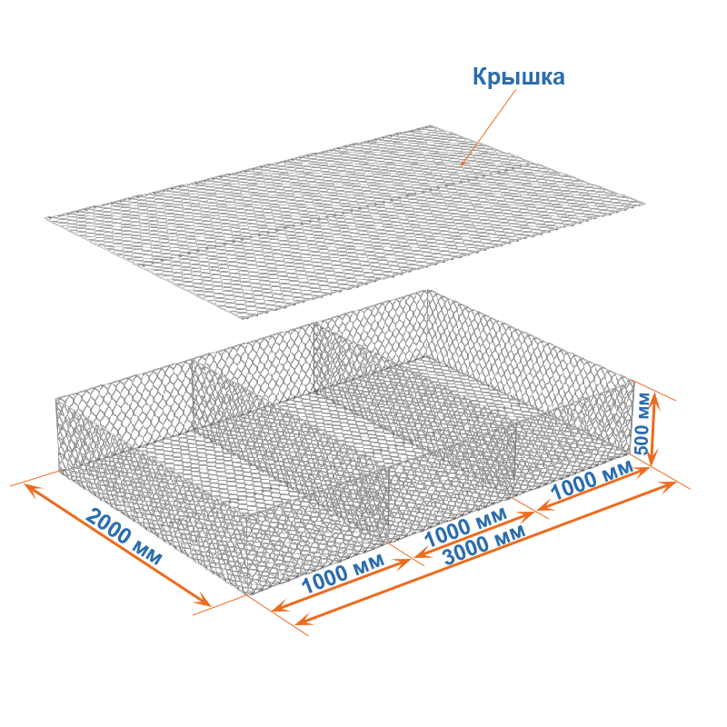Матрасы Рено 3х2х0,5 — плоские габионные секции из сетки двойного кручения с ячейкой 60х80, проволокой 2,2 мм и покрытием Цинк.